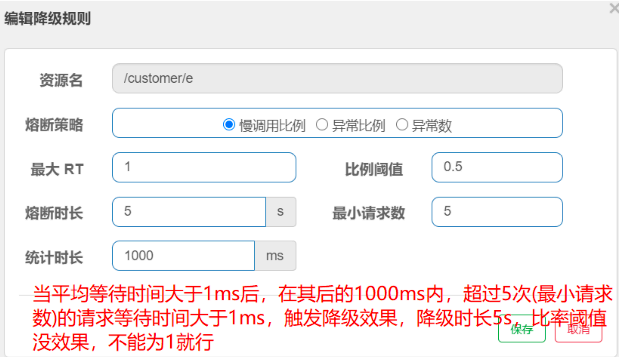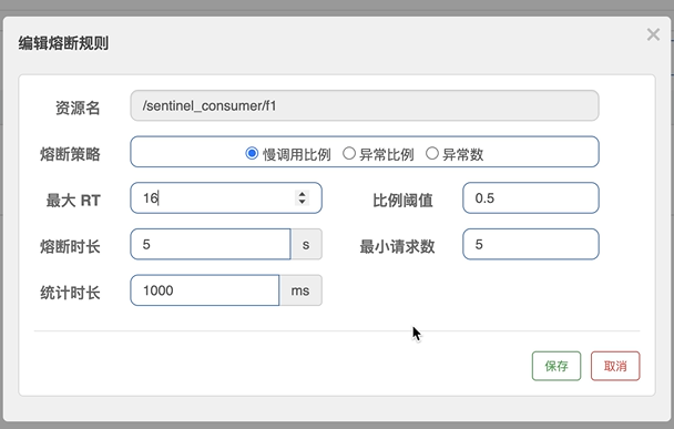 - 慢调用比例:当资源的响应时间超过最⼤RT(以ms为单位,最⼤RT即最⼤响应时间)之后,资源进⼊准降 级状态。如果接下来1ms内持续进⼊5 个请求(最⼩请求数),他们的RT都持续超过这个阈值,那么在接下 的熔断时⻓(以s为单位)之内,就会对这个⽅法进⾏服务降级。