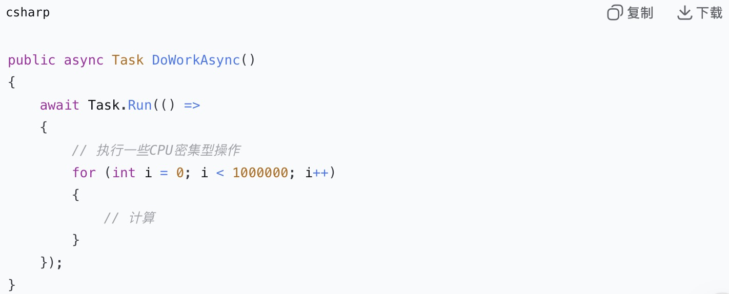 程编程结合, 特别是当使用Task.Run来将工作卸载到线程池时; 这样, 你可以在异步方法中启
