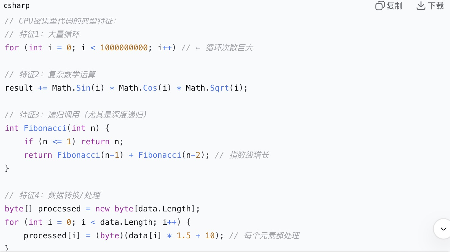 CPU的使用率很高(接近100%), 因为任务需要大量的计算; CPU没有时间去休息, 一直在执行