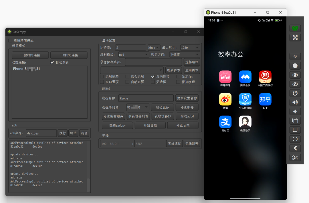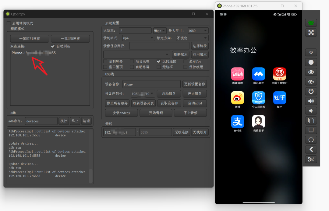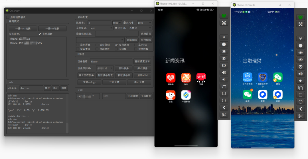 不过要注意,同一台手机用 USB 连和用 WIFI挺牛的是,QtScrcpy 还支持多设备同时连接。