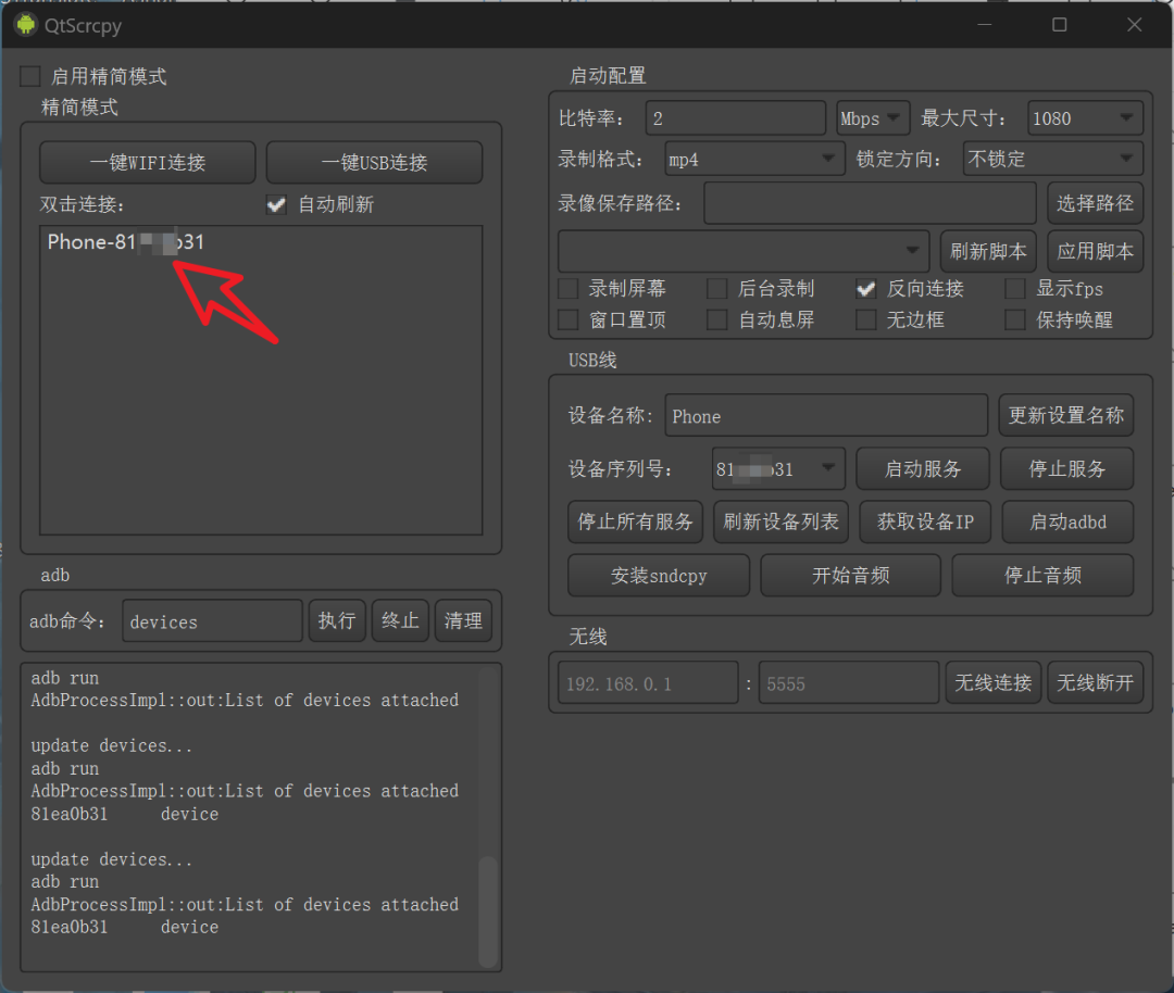 新版 QtScrcpy 依旧非常好用,直接给你整了两个一键功能:"一键 WIFI 连接"和"一键 USB 连接"。
