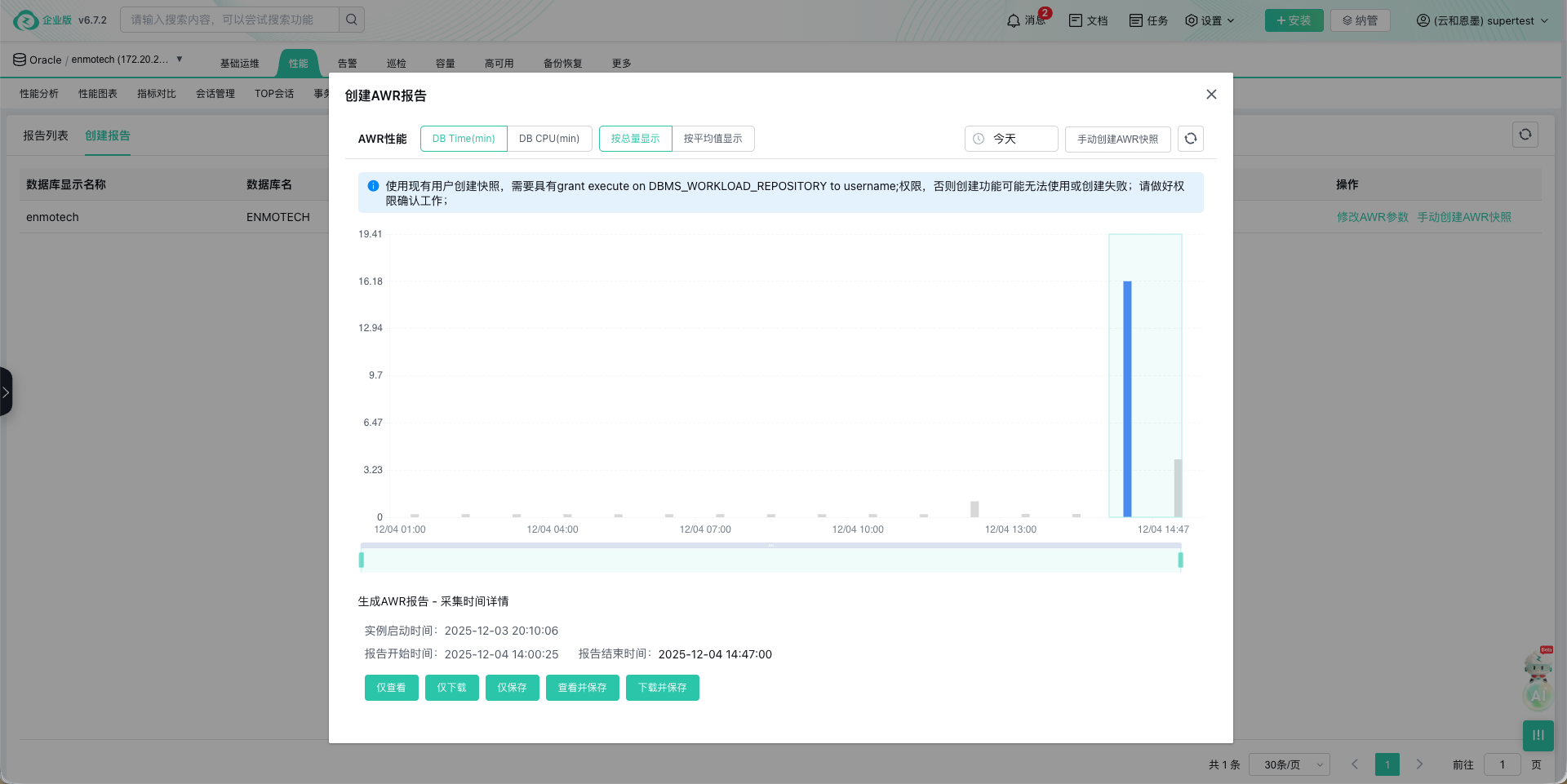 更重要的是,平台能将此次操作与当时的系统快照(如ASH/AWR性能数据、锁争用情况)智能关联。复盘时,我们不仅能确知"DBA张三在10:05杀死了某个会话",更能清晰地看到"该操作前,系统已因此会话陷入长达十分钟的严重阻塞",从而客观评估操作的必要性与影响。这为合规审计、责任厘清与知识沉淀提供了铁证。云和恩墨的zCloud平台,还可以生成和管理AWR报告。让DBA的时候复盘更简单。图3 展示了系统生成和管理AWR报告的过程。