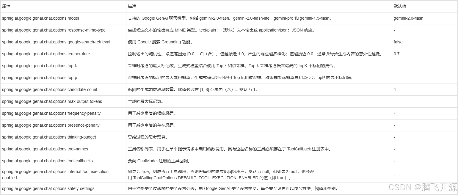 所有以 spring.ai.google.genai.chat.options 为前缀的属性都可以在运行时通过向 Prompt 调用添加请求特定的"运行时选项"来覆盖。