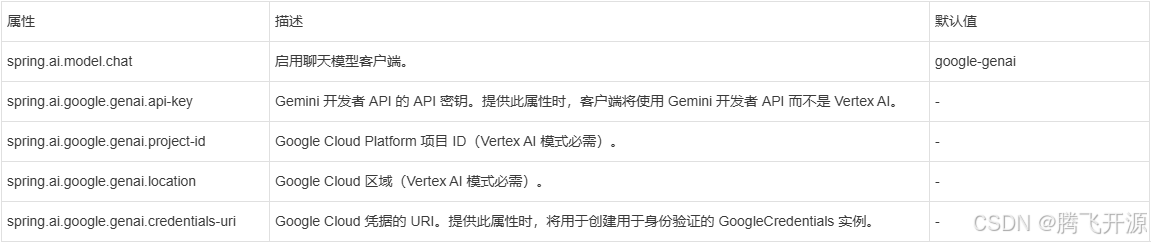 属性前缀: 使用 spring.ai.google.genai 而不是 spring.ai.vertex.ai.gemini。