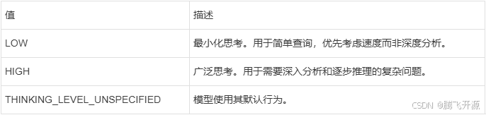 Gemini 模型支持"思考"能力,允许模型在生成响应之前进行更深层次的推理。这通过 ThinkingConfig 进行控制,其中包括三个相关选项:thinkingBudget、thinkingLevel 和 includeThoughts。