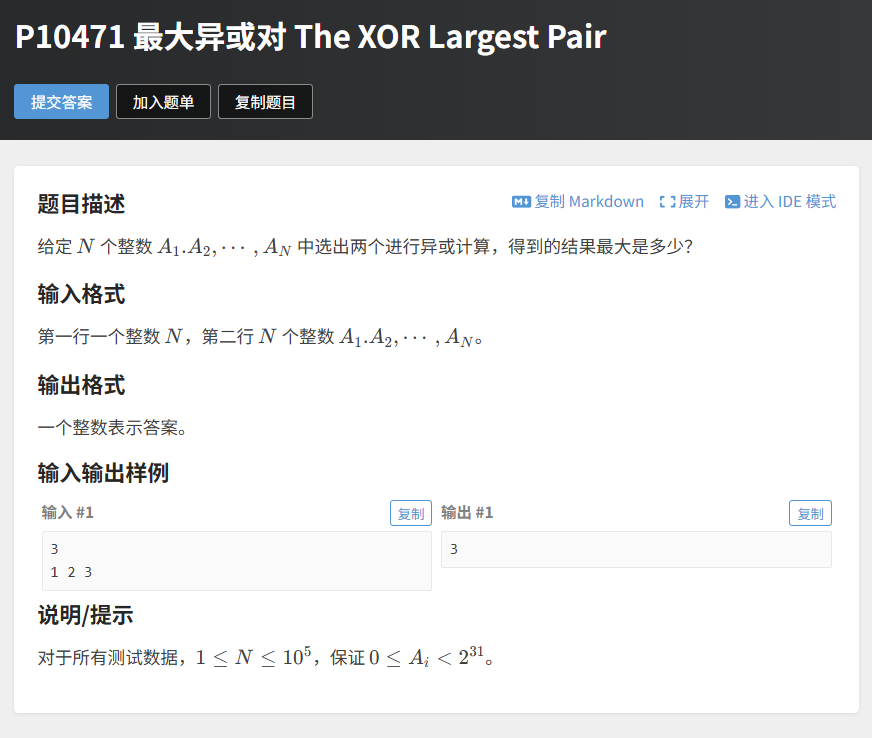 [4.3 题目 3:洛谷 P10471 最大异或对](#4.3 题目 3:洛谷 P10471 最大异或对)