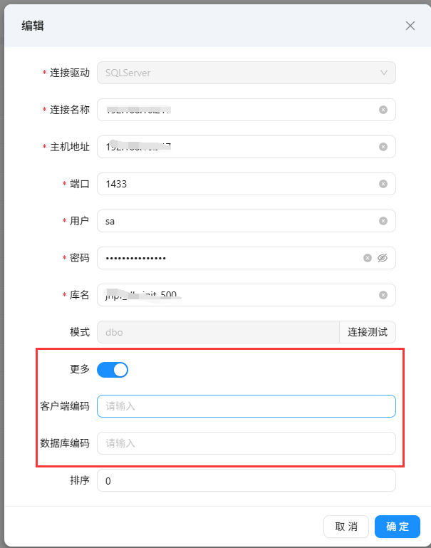 增加"更多";数据库特殊字符集配置。没有就不用开启"更多";默认是关闭状态