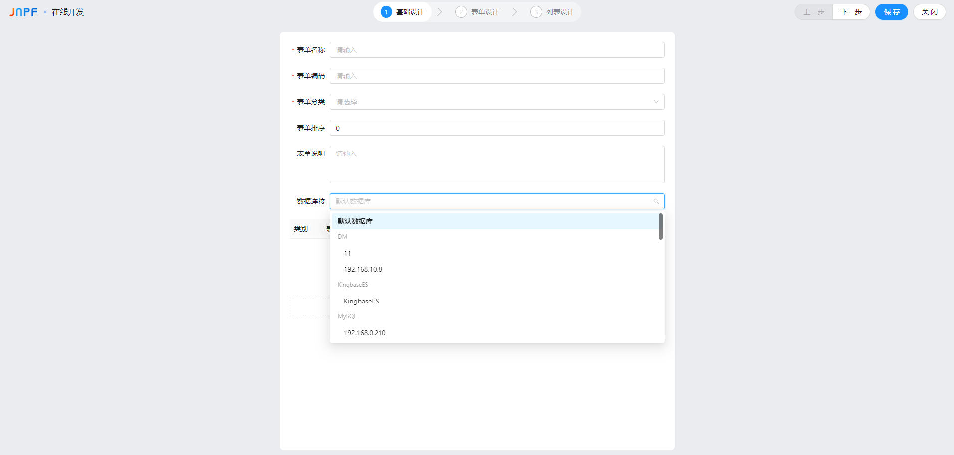 在表单设计、数据建模等模块的数据连接都可以选择创建连接成功的数据库