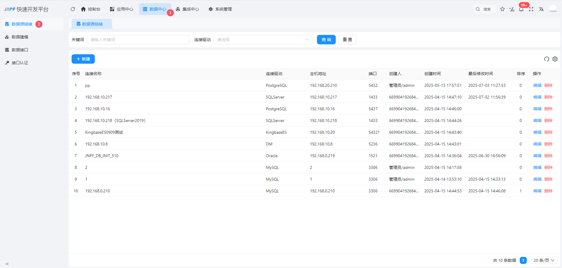 JNPF 数据中心的数据源链接功能直接打通多库壁垒 ------ 支持 MySQL、DM、Oracle、SQLServer、KingbaseES、PostgreSQL 六大主流数据库,一键新建连接、测试连通性,还能配置特殊字符集,为后续的表单数据调用、数据建模筑牢基础。本文拆解数据源链接的全流程操作,新手也能快速搞定多库适配!