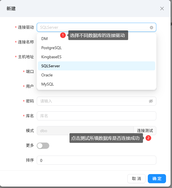 点击新建,设置相关数据库信息。设置下拉选择连接驱动,并填写连接名称、主机地址、端口等相关信息,点击确认即可成功新建数据连接