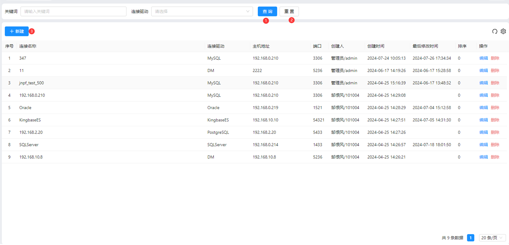 在【数据源链接】页面,支持查询(根据连接名称关键词或连接驱动查询)、重置、刷新、新建数据操作