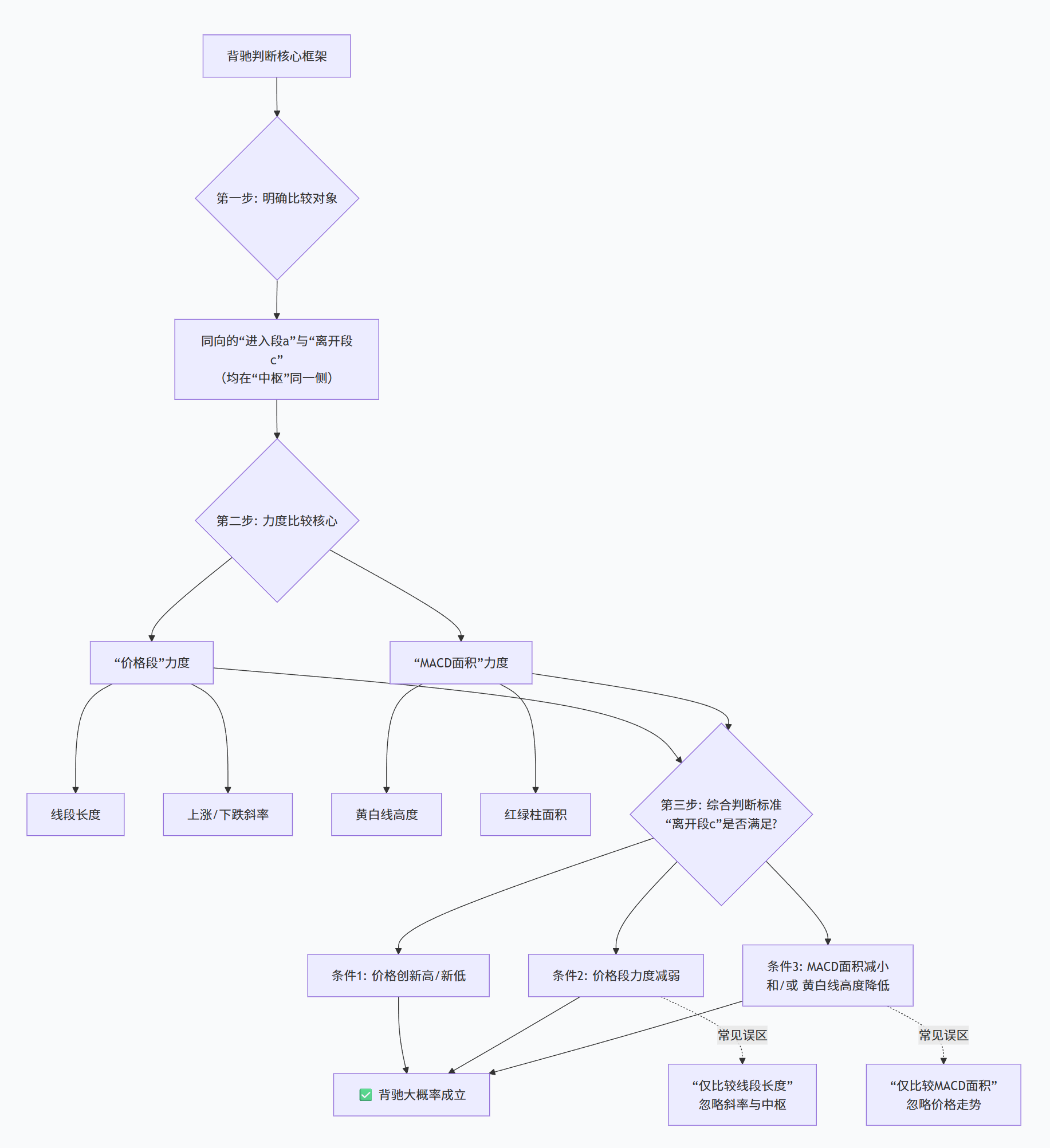 简单来说,最核心的比较是进入中枢的"进入段"与离开中枢的"离开段",而MACD是其最重要的辅助验证工具。下图清晰地展示了背驰判断的核心逻辑框架与验证工具: