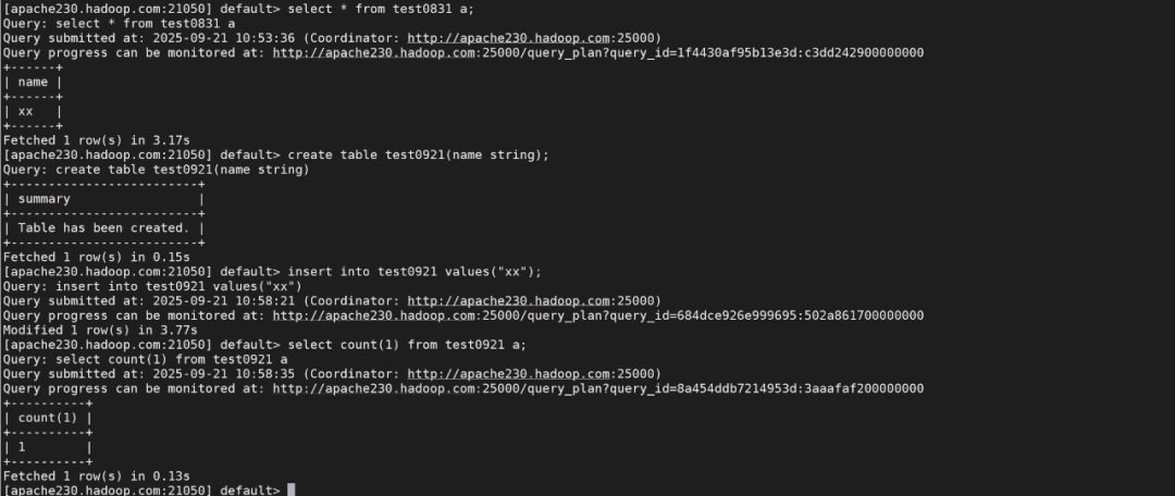 impala-shell -i apache230.hadoop.com:21050 -d default (默认走21050端口)