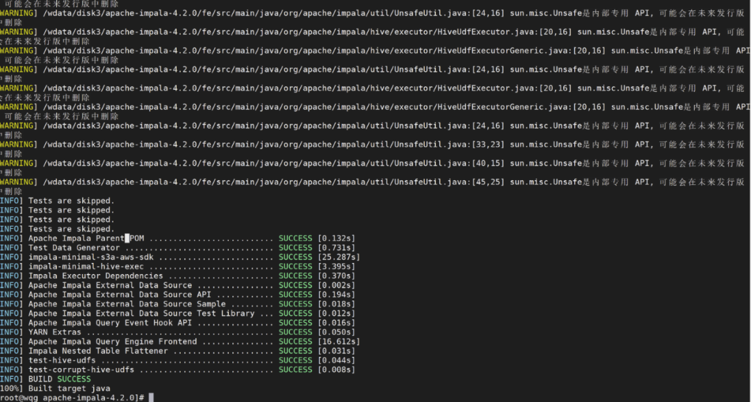 [root@wqg apache-impala-4.2.0]# export IMPALA_HOME=`pwd`[root@wqg apache-impala-4.2.0]# bin/bootstrap_system.sh...[root@wqg apache-impala-4.2.0]# $IMPALA_HOME/buildall.sh -noclean -notests