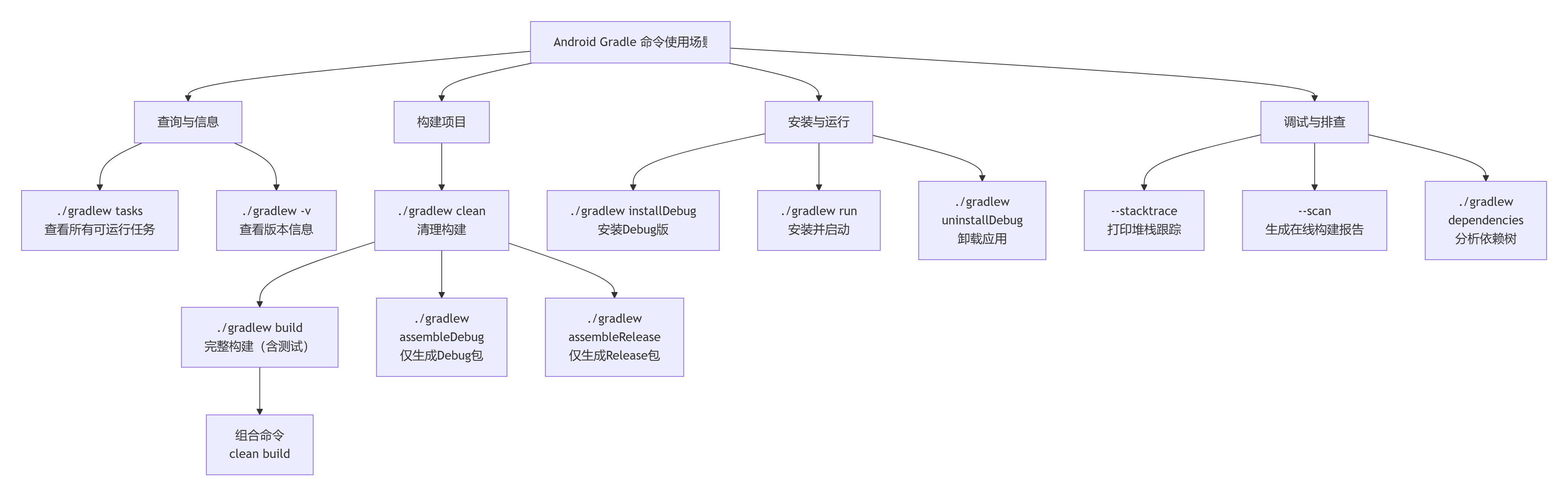 | 调试与排查 | ./gradlew dependencies | 显示项目的依赖关系树,是解决依赖冲突的神器。 |