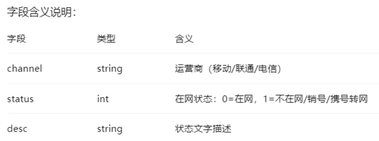 手机在网状态查询接口的功能是:通过手机号实时查询运营商在网状态,并返回号码所属运营商及状态描述。