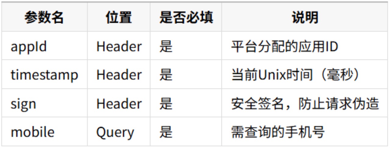Header(请求头):身份验证相关信息;Query(请求参数):用户手机号。