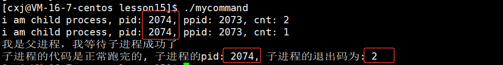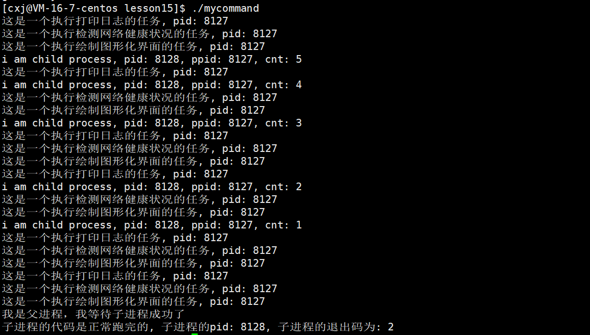- 0-2秒:子进程每秒打印1次,共2次,之后子进程退出。