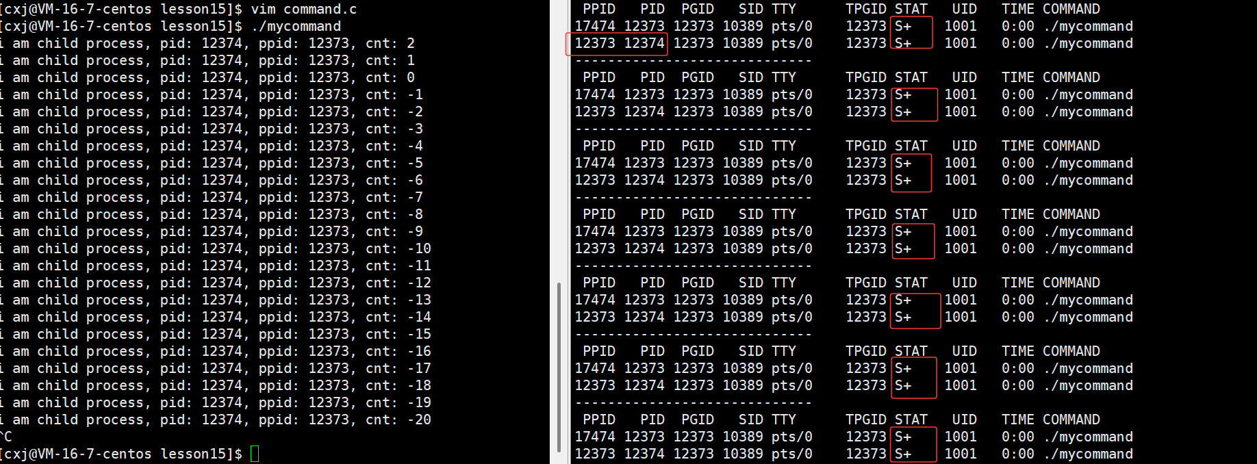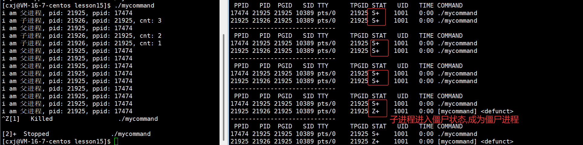 - 当然如果想观察到子进程的僵尸状态,那么可以在两个for循环之间让父进程休眠比单个子进程的休眠时间长即可,这样子进程打印,休眠结束,此时父进程还在休眠,无暇等待子进程,此时子进程的僵尸状态就可以被我们检测到