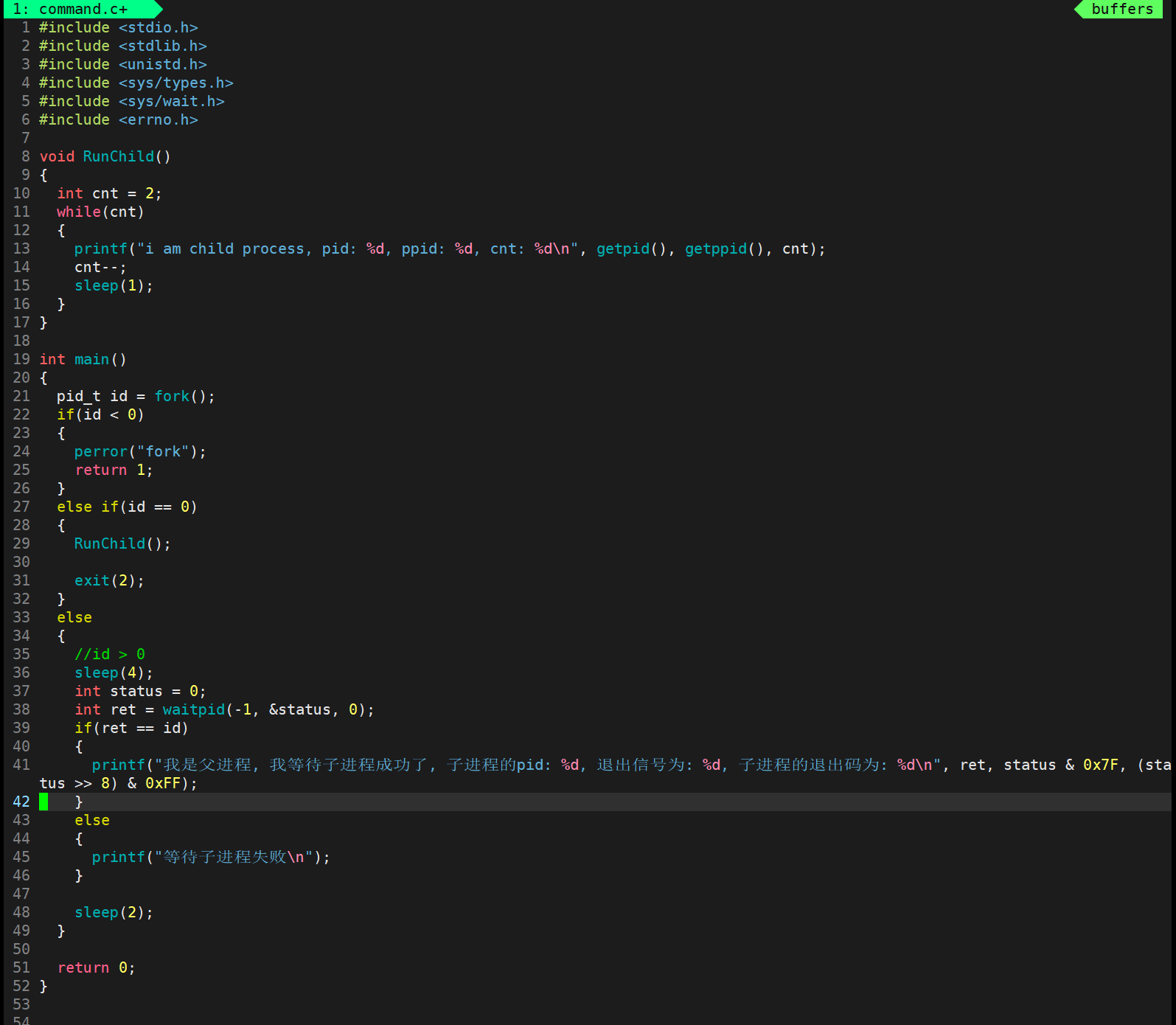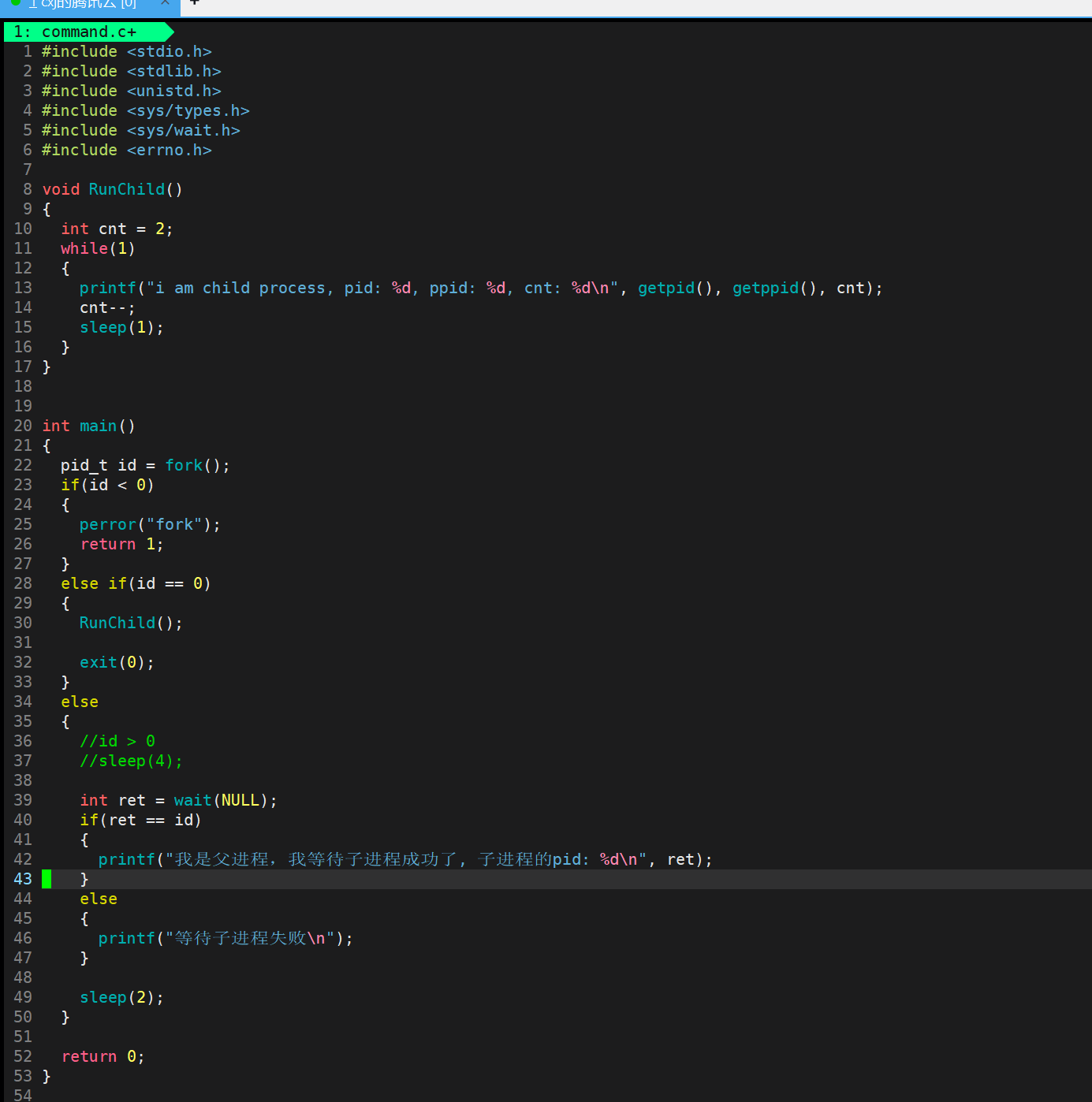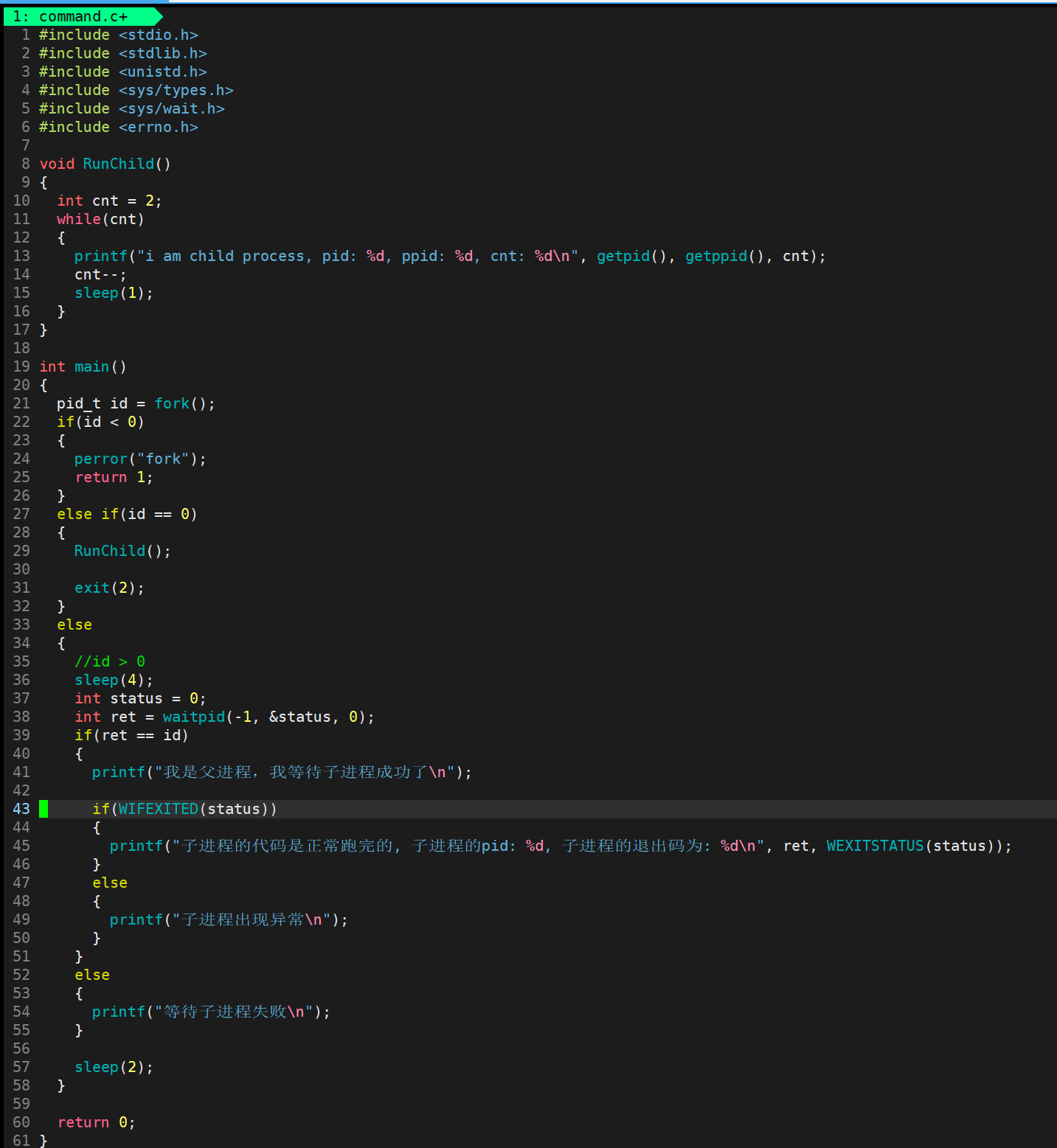 那么下面我们使用这个wait让父进程去等待子进程的退出