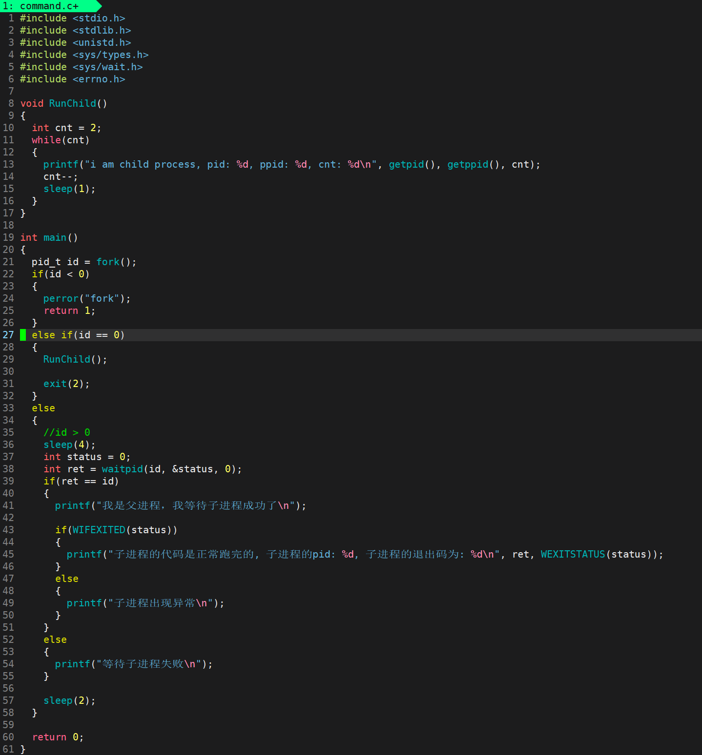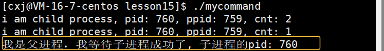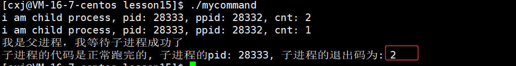 - 当子进程退出的时候,此时waitpid返回等待的子进程的pid,id接收waitpid的返回值,id > 0,父进程判断子进程是否出现异常,以及结果是否正确