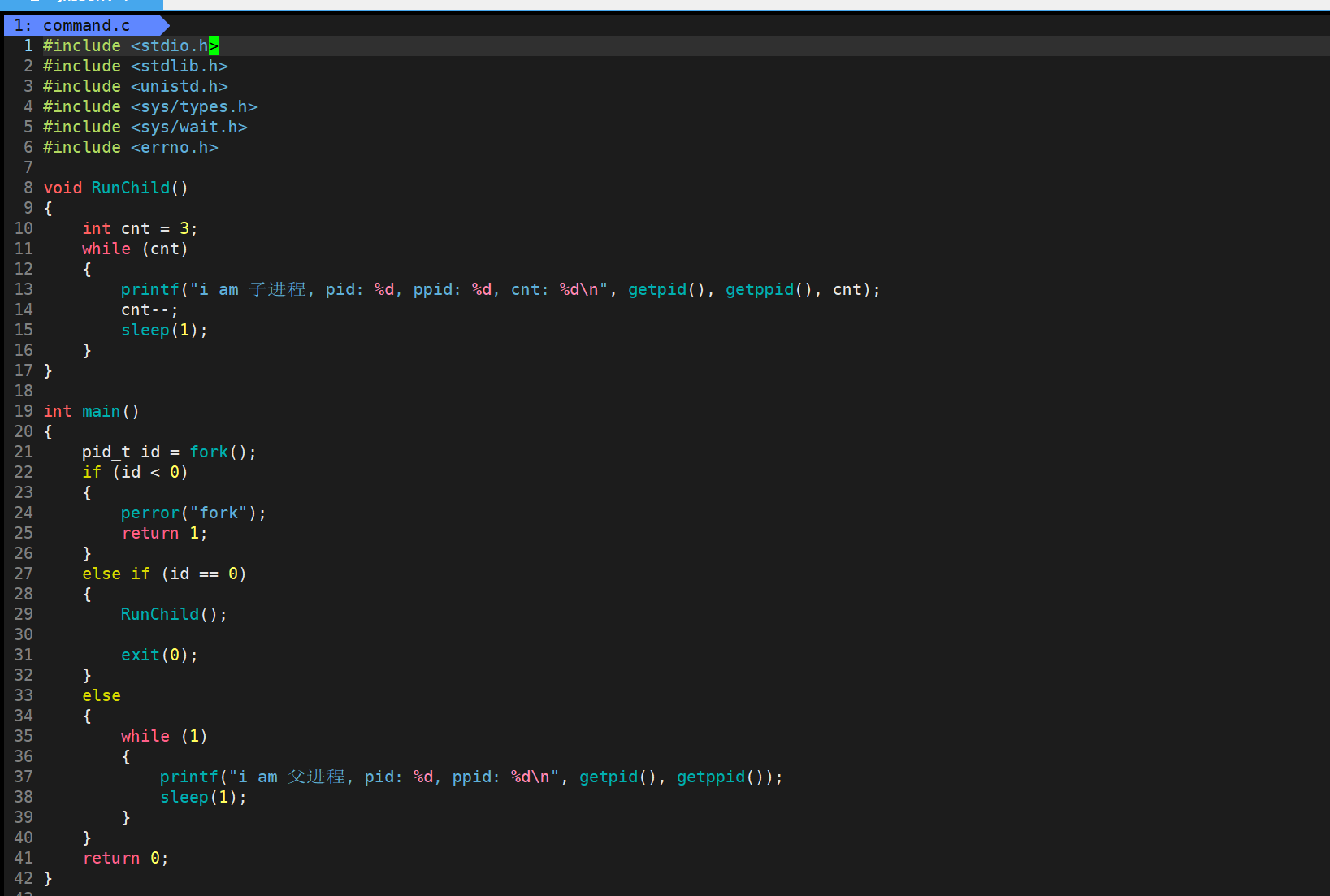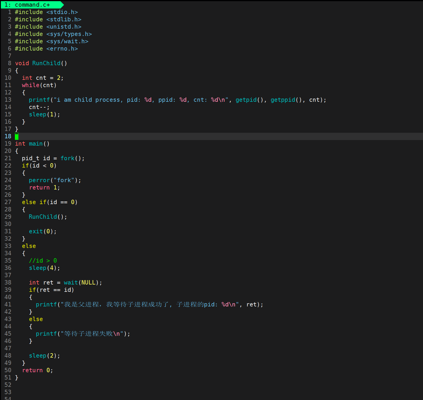 那么为了演示父进程的阻塞状态,我们可以将子进程执行的RunChild函数修改一下,让它直接死循环打印,当子进程调用它的时候就会一直死循环打印进程信息,同时父进程就一直使用wait等待子进程退出即可