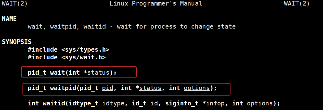 同样的,我们可以通过man 2 waitpid命令查看相关手册,使用时需要包含头文件: