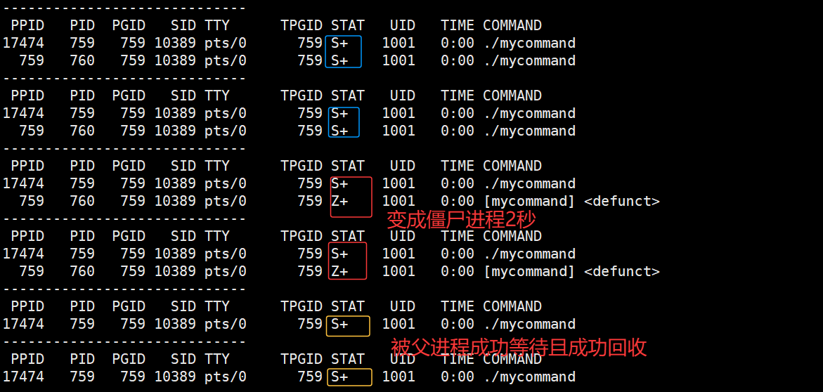 - 2-4秒:子进程已退出,父进程仍在 sleep(4) ,子进程处于僵尸态(Z状态),无任何打印。