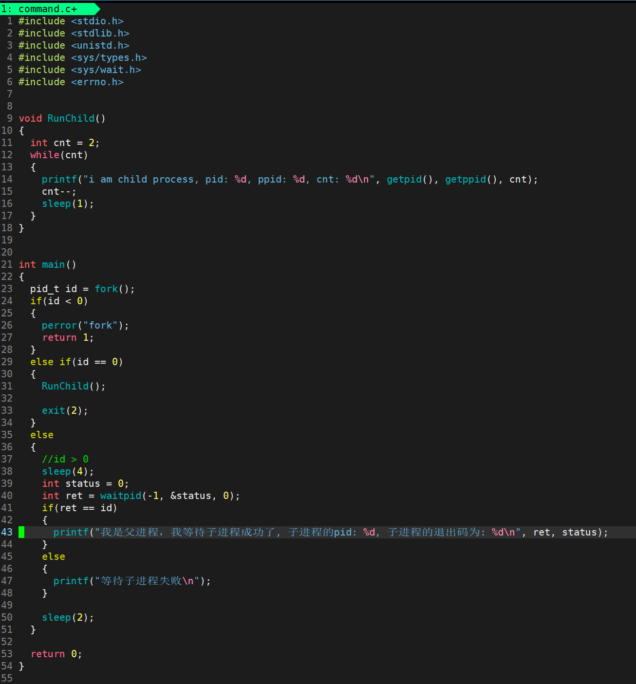 我们在父进程中使用waitpid等待子进程退出,其中第一个参数传入-1表示等待当前父进程的任意一个子进程退出,第二个参数传入NULL,表示不想获取子进程的退出信息,第三个参数传入0,表示进行和wait进行一样的阻塞等待模式