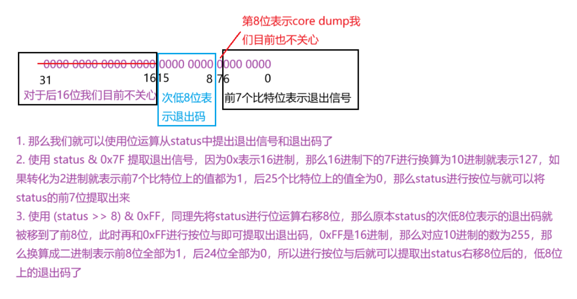 - 操作系统通过位运算在status中编码退出信息