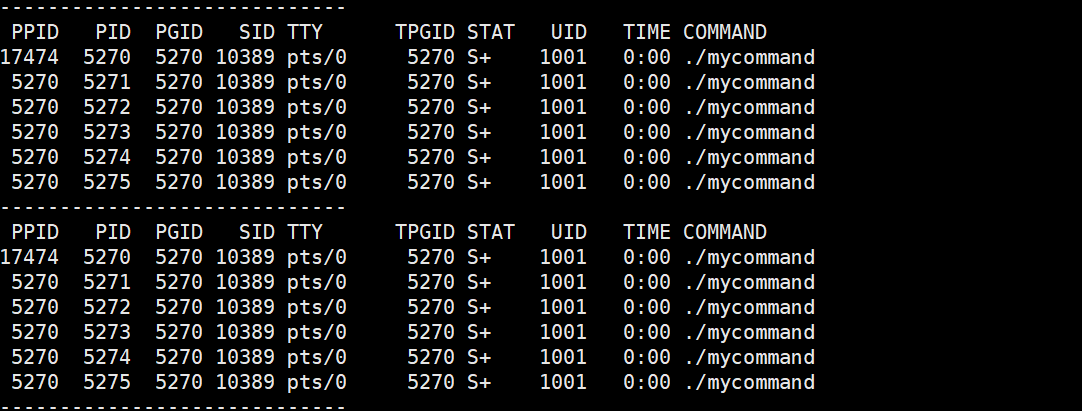 while :; do ps ajx | head -1 && ps ajx | grep mycommand | grep -v grep; sleep 1; echo "-----------------------------"; done