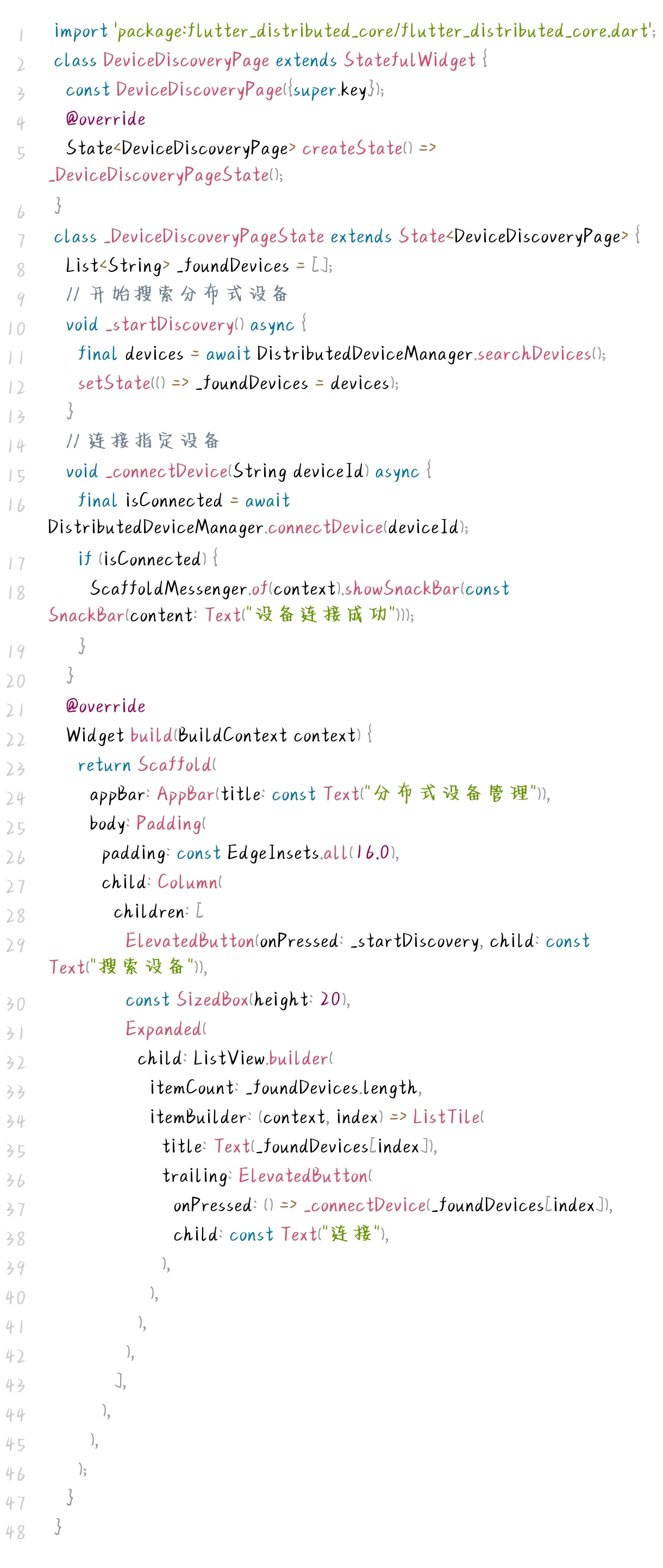 实现Flutter应用跨设备发现与配对,核心代码如下: