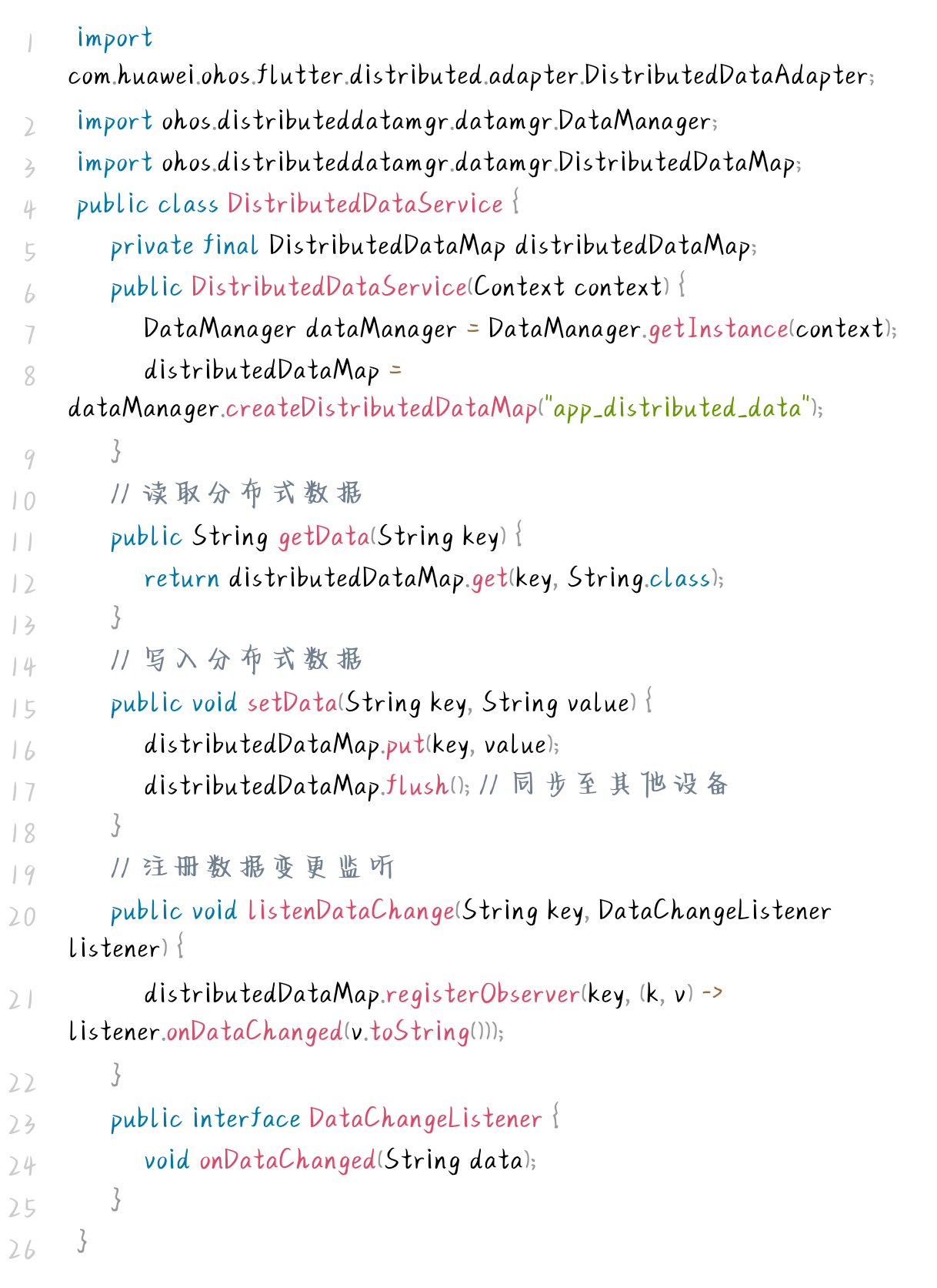 - 鸿蒙原生端通过分布式数据管理服务,创建可共享的数据对象(如用户信息、应用状态),并注册数据变更监听器;