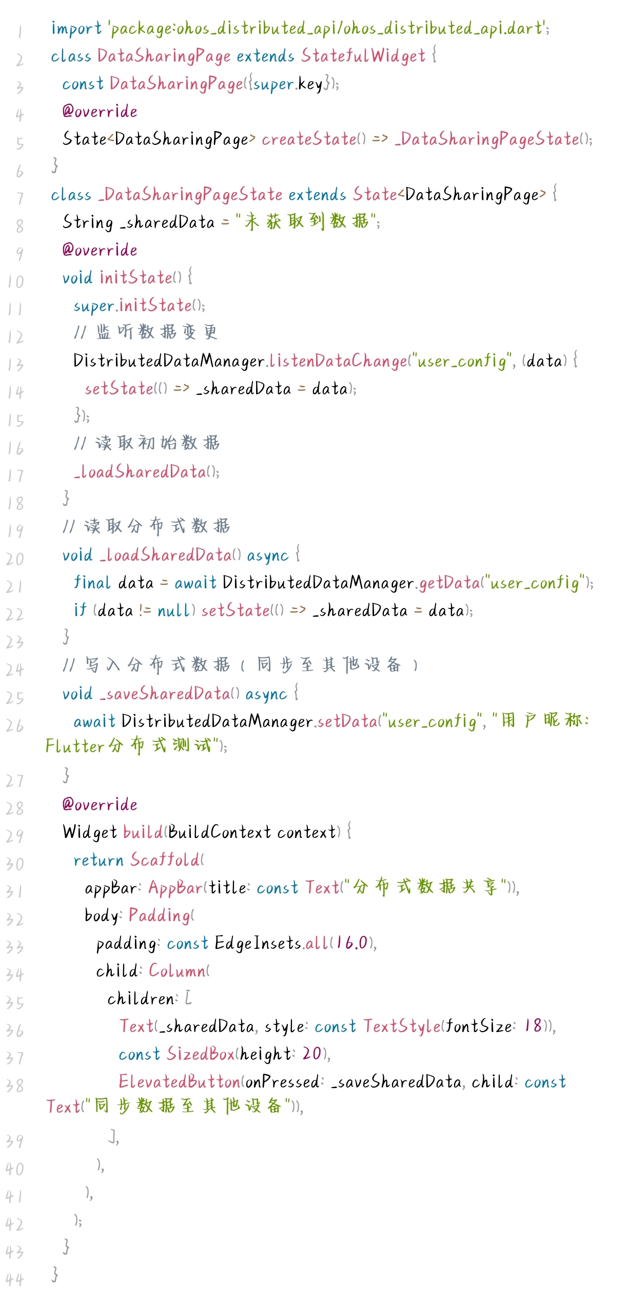 - Flutter端通过适配层接口,读取或修改分布式数据对象,操作指令经适配层转换后传递给鸿蒙原生端;