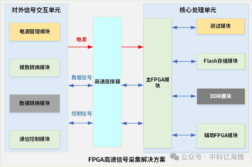 本文介绍的中科亿海微FPGA高速信号采集解决方案应用于信号采集与处理领域,用于信号的数据采集、处理和传输。该方案主要由对外信号交互单元和核心处理单元组成。