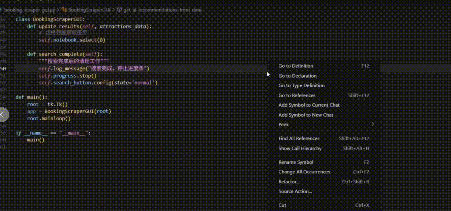 我们的目标是创建一个GUI窗口,用户输入目的地后,工具自动爬取Booking.com的景点信息,并由AI进行总结和推荐。