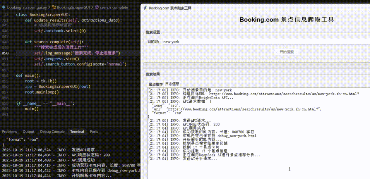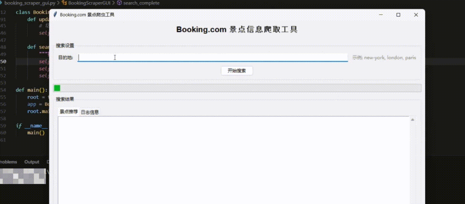 当我们运行这个Python脚本时,会弹出一个简洁的GUI窗口。在输入框中键入"纽约",点击"开始搜索"按钮,后台开始执行一系列操作:
