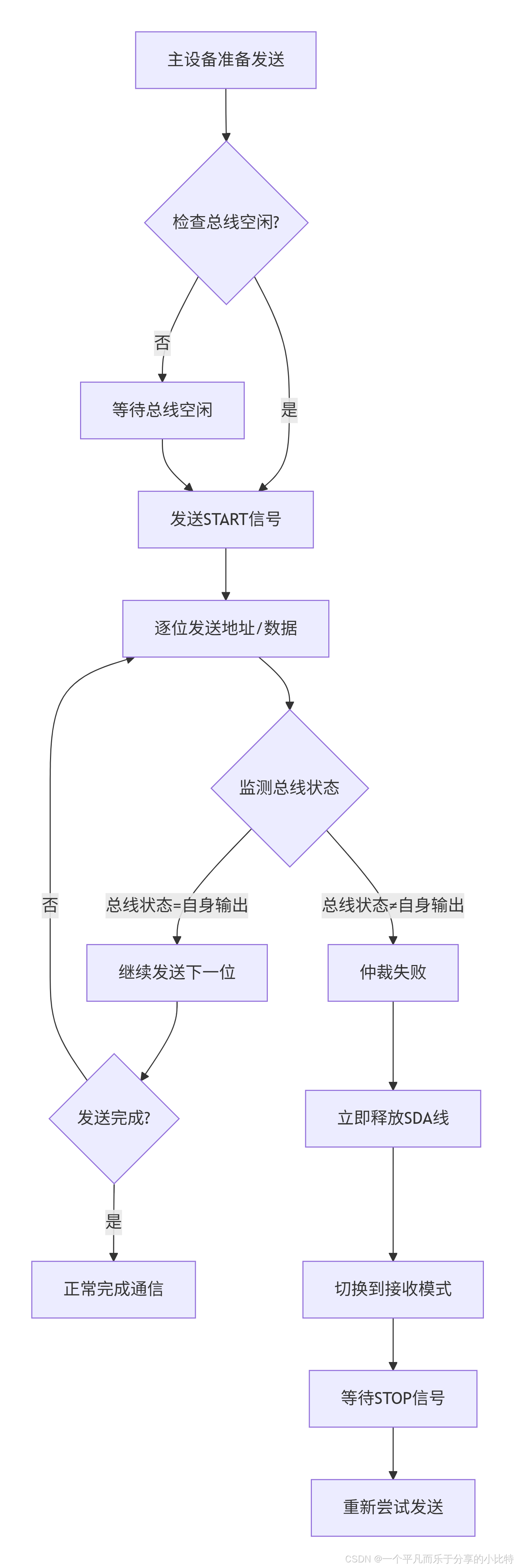 总线仲裁 是I²C协议中解决多个主设备同时访问总线冲突的机制。它允许总线在没有中央控制器的情况下,自动决定哪个主设备获得总线控制权。