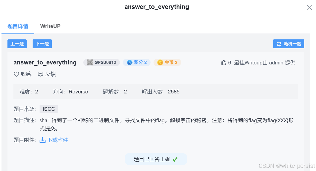 在 CTF 逆向工程领域,"answer_to_everything" 这类题目属于典型的 "输入验证 + 简单加密" 类型,适合逆向入门但又包含实战必备的分析思路。本题的核心目标是通过逆向程序逻辑,找到触发关键信息的条件,最终破解并生成符合格式的 flag。