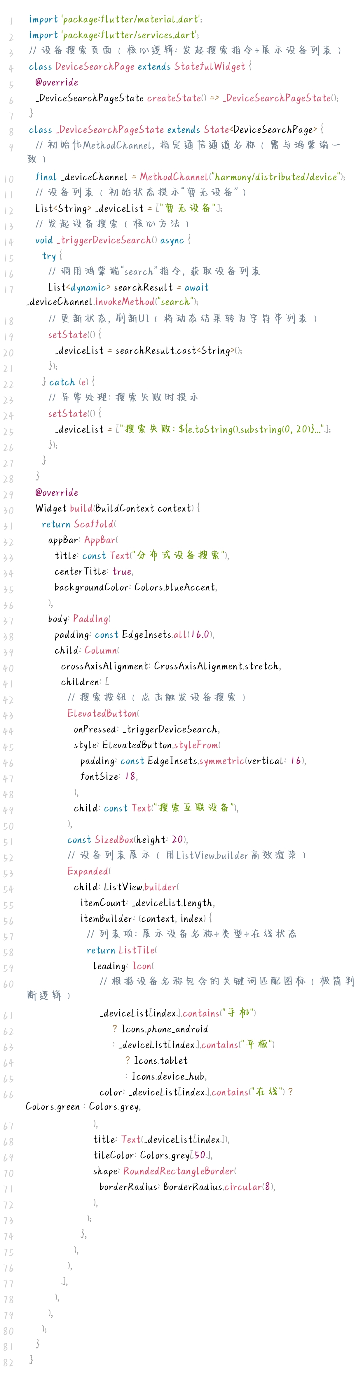 - 设备搜索依赖鸿蒙 DeviceManager 类:该类是鸿蒙分布式设备管理的核心API,可直接获取当前账号下已互联的设备列表,包含设备名称、设备类型、在线状态等关键信息;