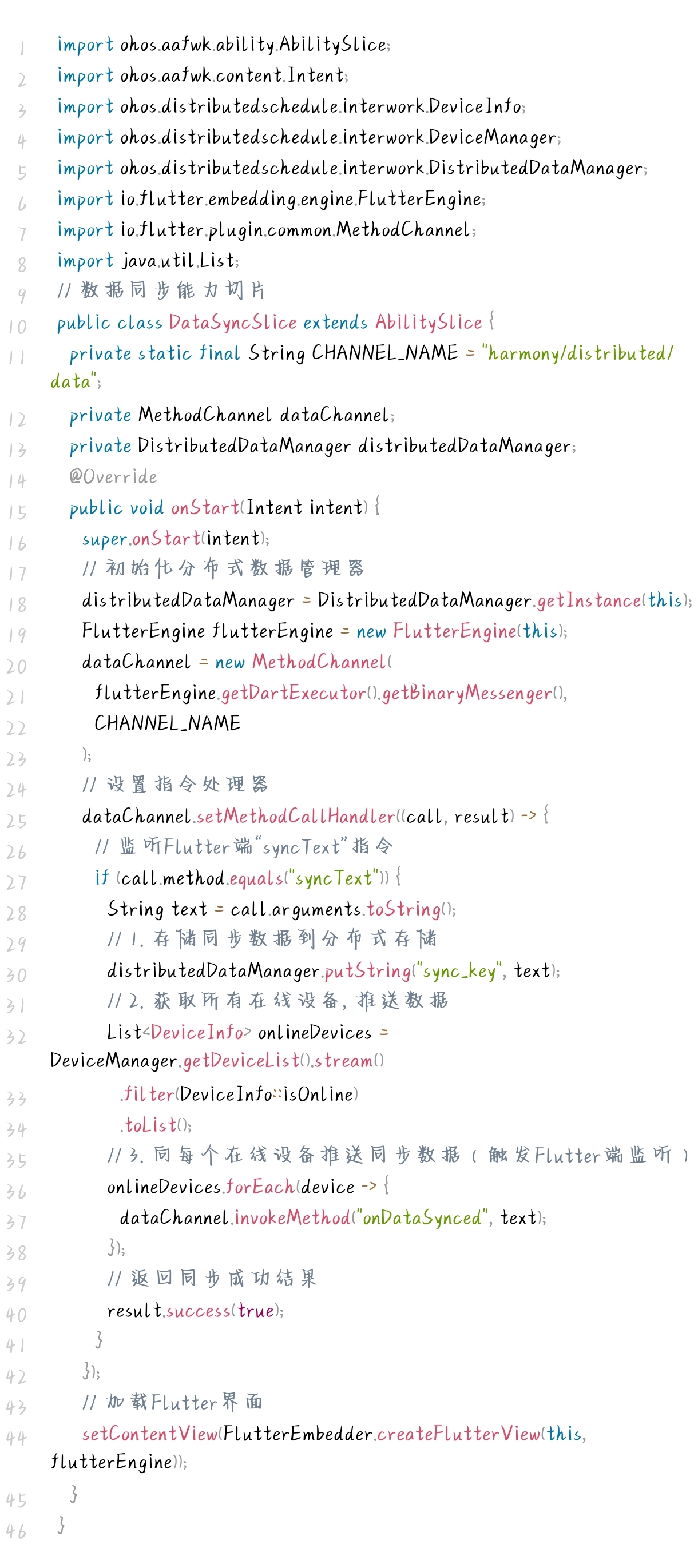 - 鸿蒙端处理完成后,通过 result.success() 将结果(如设备列表、同步状态)返回给Flutter端;