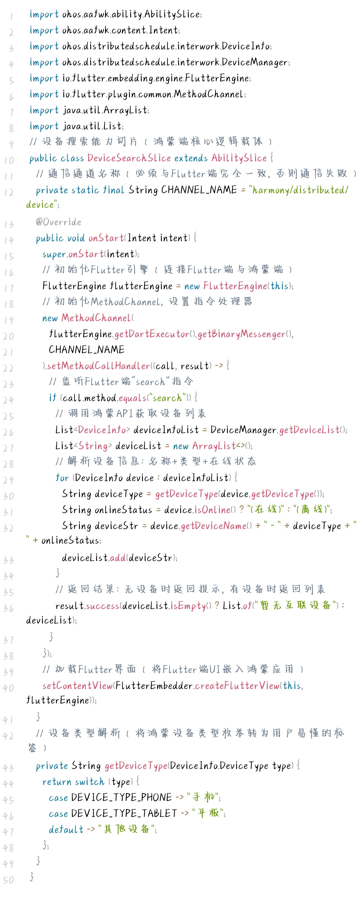 - 鸿蒙端通过 MethodChannel.setMethodCallHandler() 监听指令,接收参数后调用分布式SDK处理底层逻辑(如设备搜索、数据传输);