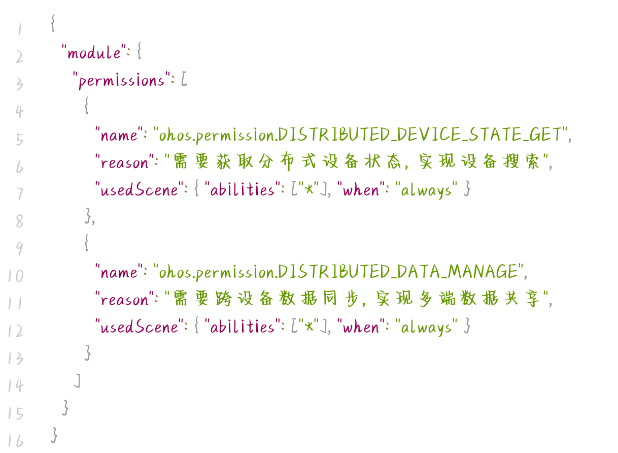 分布式能力调用必须在鸿蒙应用配置文件 module.json5 中声明对应权限,否则会调用失败,核心配置如下: