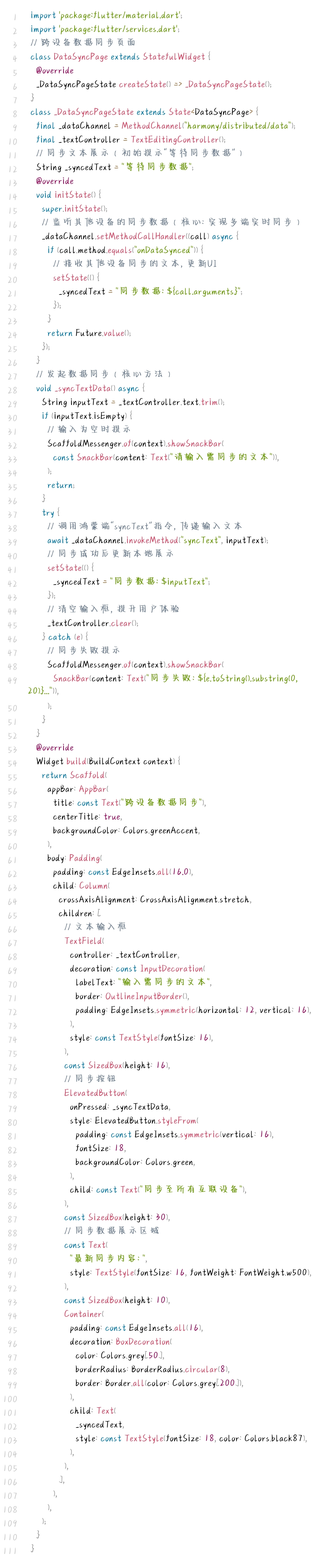 本文聚焦开发者高频需求的三大核心场景,在保持代码极致精简的前提下,补充关键技术细节、操作逻辑与用户体验优化点,不仅明确"代码怎么写",更解释"为什么这么写",帮助开发者快速理解分布式协同的核心逻辑,轻松上手开源鸿蒙与Flutter的融合开发,高效打造稳定、易用的多设备协同应用。