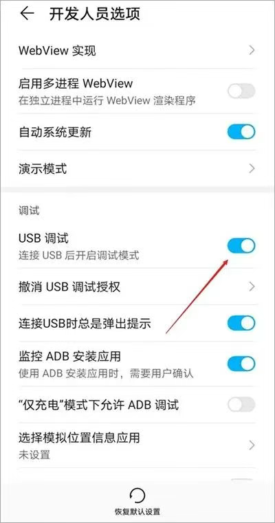 开启「开发者选项」→ 启用「USB调试」(部分设备需开启「无线调试」用于Wi-Fi连接);