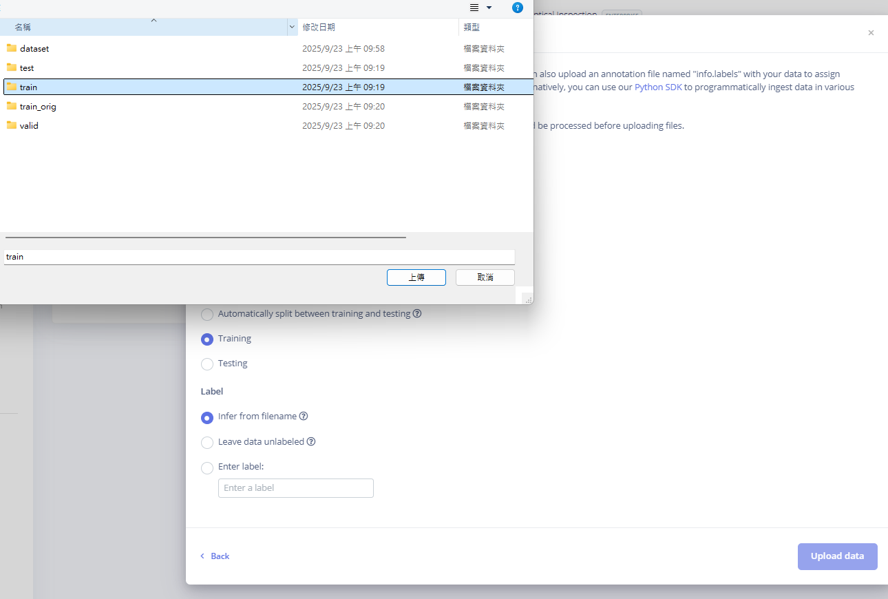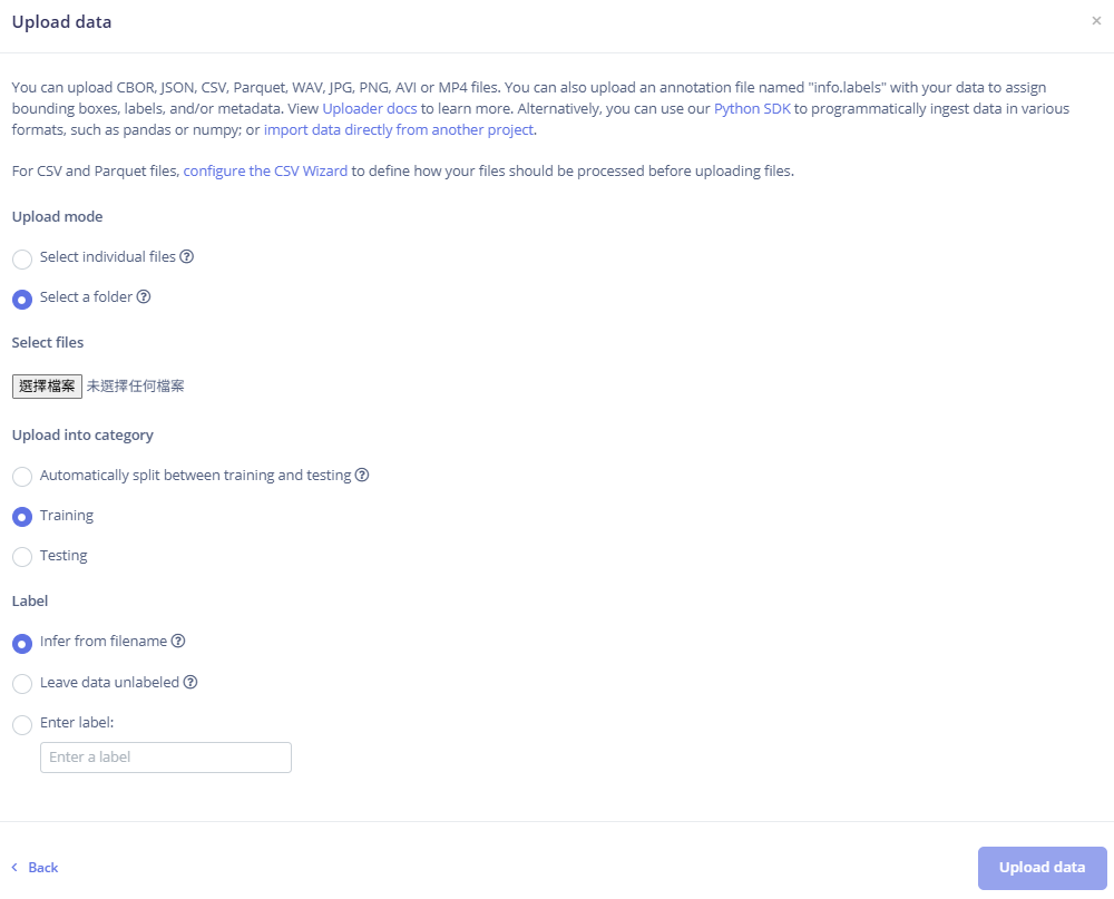 7.在"上传数据"页面,用户可选择上传单个文件或整个文件夹,指定数据属于训练集还是测试集,并通过文件名推断标签、保持无标签状态或手动输入标签来定义标签。配置完成后,点击"上传数据"按钮即可开始上传。