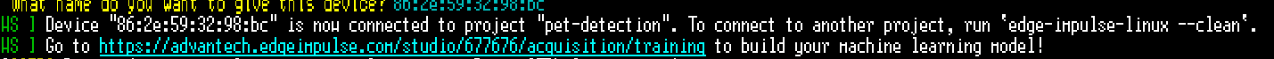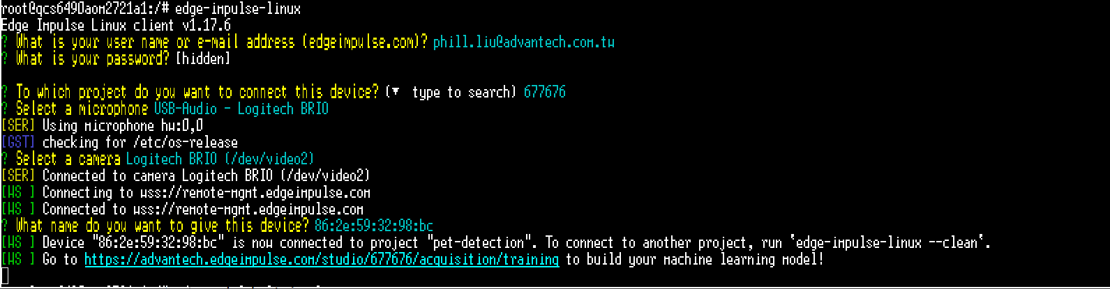 这将启动一个向导,要求您登录并选择一个Edge Impulse项目。若需切换项目或使用其他摄像头(例如USB摄像头),请使用---clean参数运行该命令。