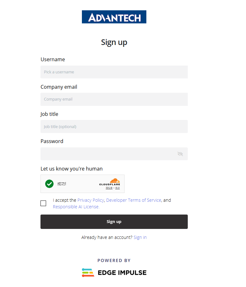 1.研华品牌Edge Impulse注册页面,用户需输入用户名、公司邮箱、职位及密码,完成验证码验证并接受服务条款后,点击"注册"按钮创建账户。