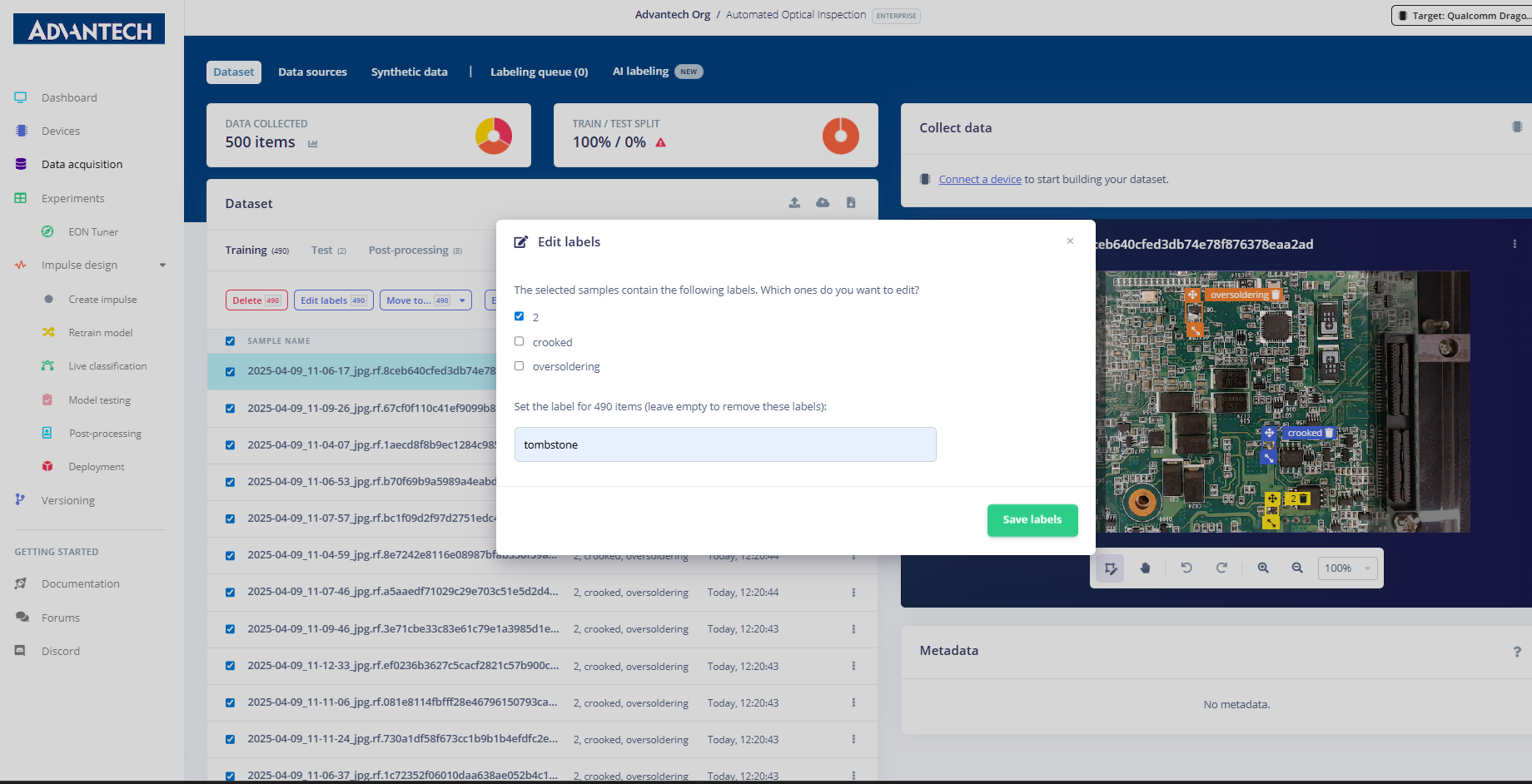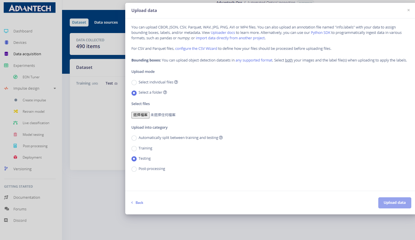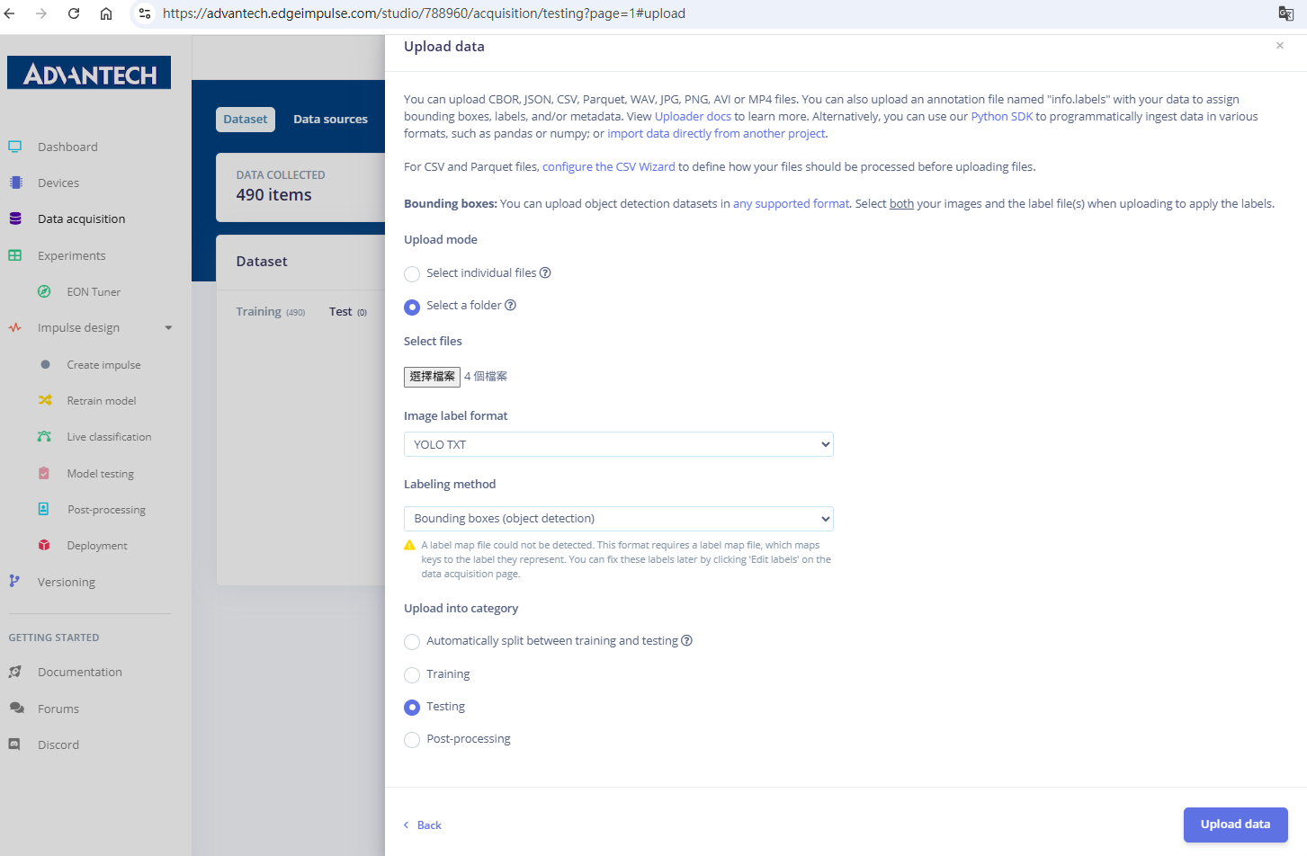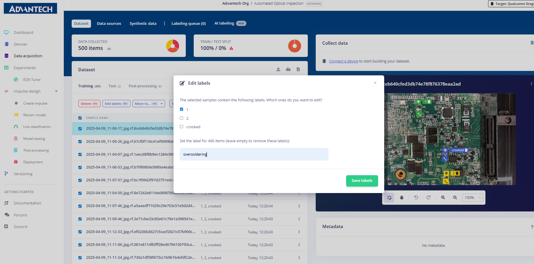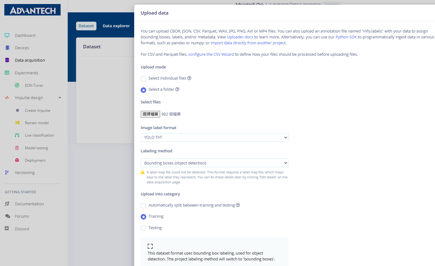 访问https://advantech.edgeimpulse.com/studio/677676/acquisition/training