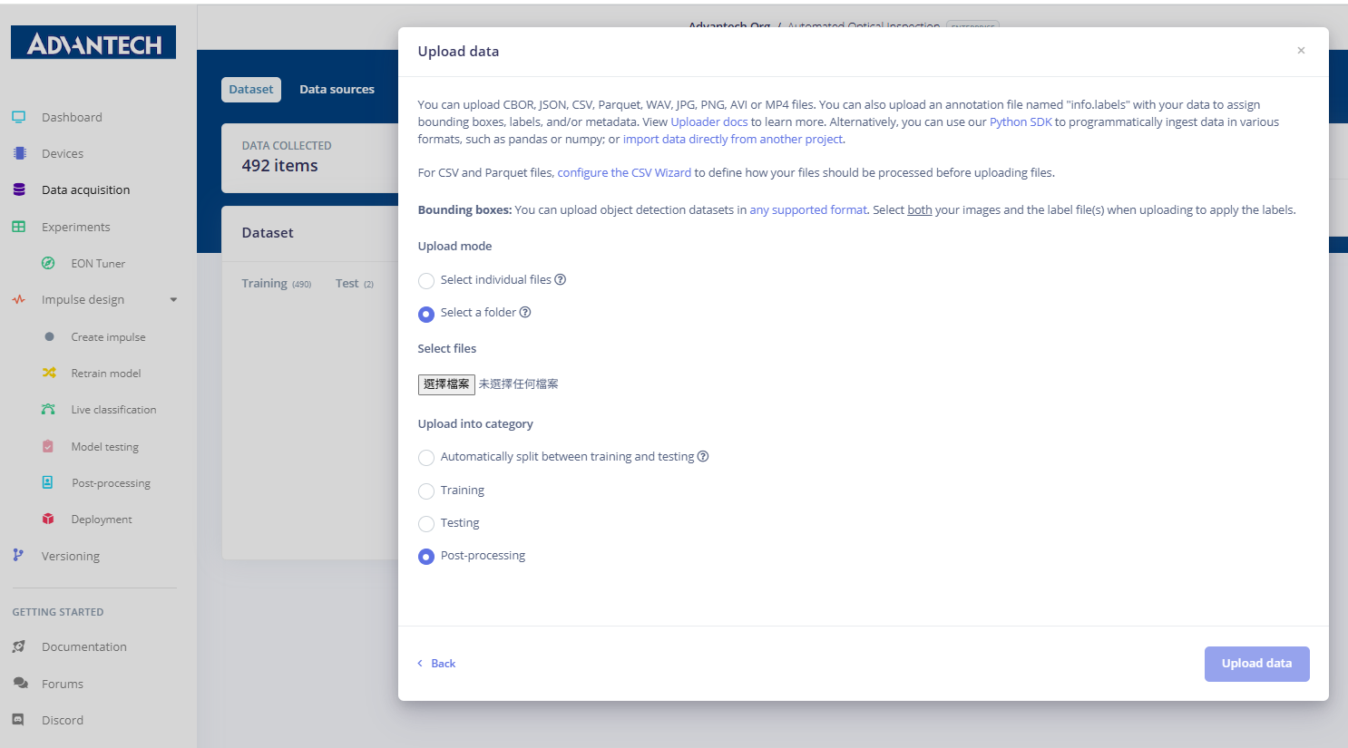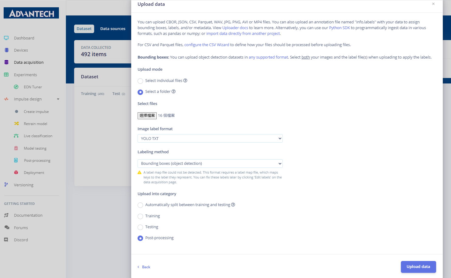 12.将后处理数据上传至Edge Impulse平台,并将其归类至后处理类别。